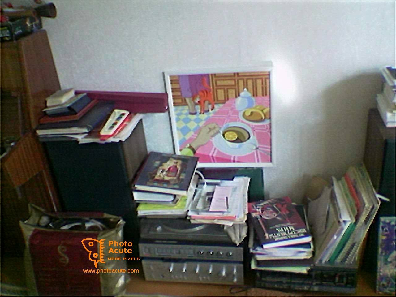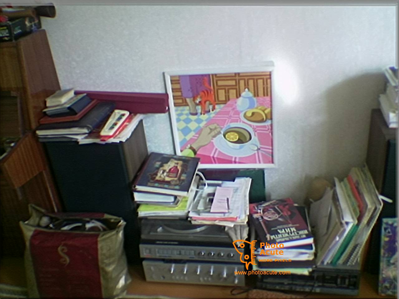 This photo contains a bundle of things, including a painting at the center. Below you can compare small and big fragments of four variants of this photo: * A standard photo, zoomed to 200% * The same standard photo, zoomed bicubically in Photoshop * The photo, made by PhotoAcute from a single snapshot * The photo, merged by PhotoAcute from four snapshots Full photos available by links below |